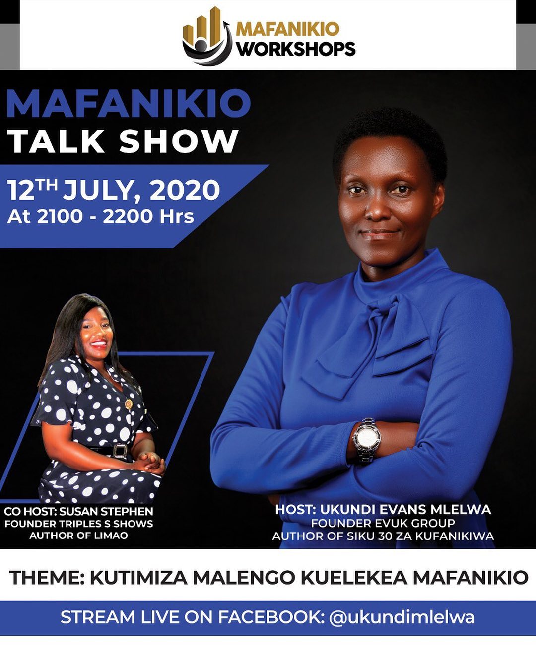 KARIBU KWENYE MAFANIKIO TALK SHOW Thursday, 09 July 2020 Vowels Limited Hits: 234 KARIBU KWENYE MAFANIKIO TALK SHOW itakayo fanyika Facebook live @ukundimlelwa with @suestephen @closet.sues Tarehe 12th July,2020 saa tatu usiku mpaka saa nne usiku .Karibu sana Next tweet